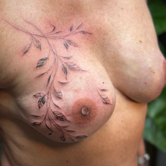 Přikládám fotky a videa z procesu, abyste mohli vidět prsa s jizvami, proces přípravy tetování a hotové tetování. Kleopatra má ráda minimalismus, tak jsme se rozhodli nezakrývat jizvy po celé jejich délce a velikosti, ale upřednostnit spíš lehkost lístečků a jejich jemnost. Nevadilo nám tedy, že jizva někde pod lístečky bude prosvítat, preferovali jsme tvar tetování a fakt, že inkoust jako takový odvede od jizev pozornost už jen proto, že je oproti jizvě tmavý.